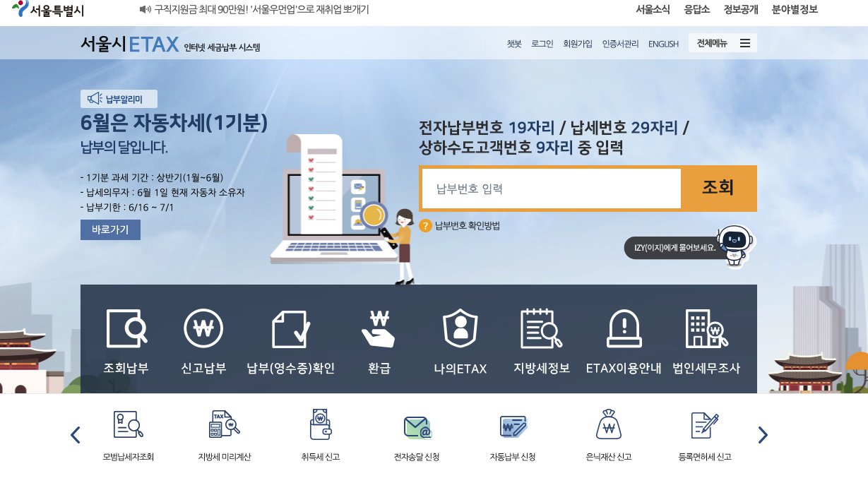 서울 지역에서는 이텍스 홈페이지를 통해 자동차세 조회 및 납부가 가능합니다. 우편으로 받은 고지서 번호를 입력하거나, 개인정보를 입력 또는 로그인하시면 자동차세 금액을 확인 하 실 수 있습니다.