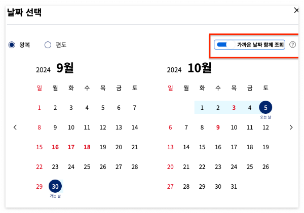 - 여행 일정이 자유롭다면 주변 날짜에 여유있는 비행기 티켓까지 함께 볼 수 있습니다.
