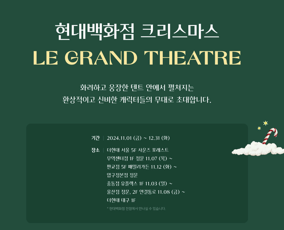 올해의 테마인 "LE GRAND THEATRE"는 거대한 극장을 배경으로 한 마법 같은 여정을 담고 있습니다. 동화 같은 장식과 캐릭터들이 크리스마스 분위기를 더해주어 가족, 친구와 함께 환상적인 분위기를 즐길 수 있습니다.