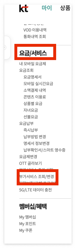 - '마이' 버튼을 선택하고 요금/서비스 텝에서 '부가서비스 조회/변경' 페이지를 클릭합니다.
