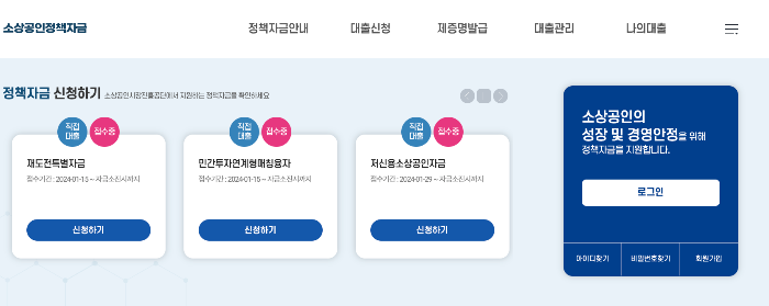 소상공인 정책자금 누리집(https://ols.semas.or.kr/ols/man/SMAN010M/page.do)에서 신청합니다.