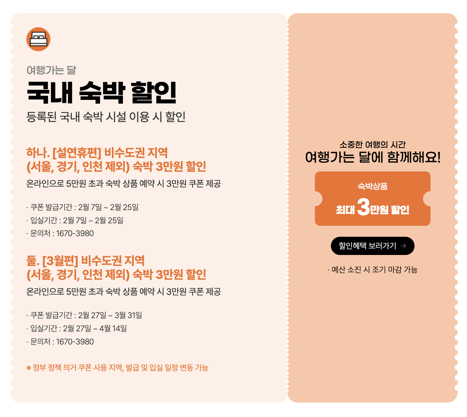 - 쿠폰 사용방법 : 참여 온라인 여행사에서 할인권 발급받기 > 가고 싶은 국내 숙박 선택하기 > 숙박 할인권으로 할인받기 > 여행 즐기기