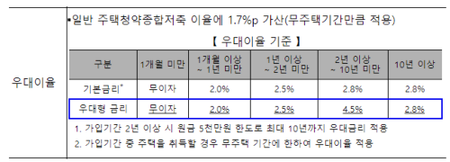 - 일반 주택청약통장보다 최대 1.7%까지 무주택자 우대이율을 받을 수 있습니다.
