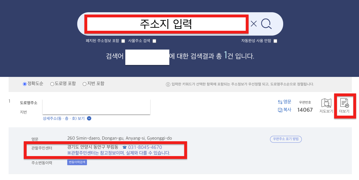 1. 이사 예정 주소지 입력 2. 더 보기 클릭 3. 관할주소지 확인하여 방문하시면 됩니다.