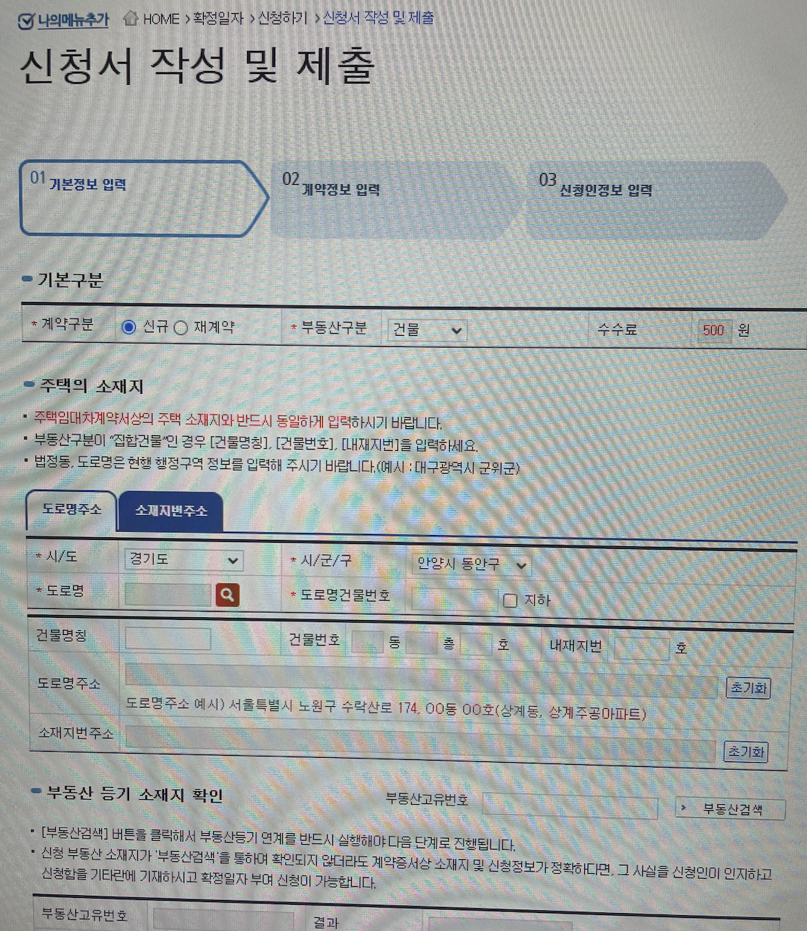 -기본정보를 입력합니다. 계약구분, 계약주소를 입력하고 부동산 검색 버튼을 눌러 확인 후 저장 후 다음을 클릭합니다.