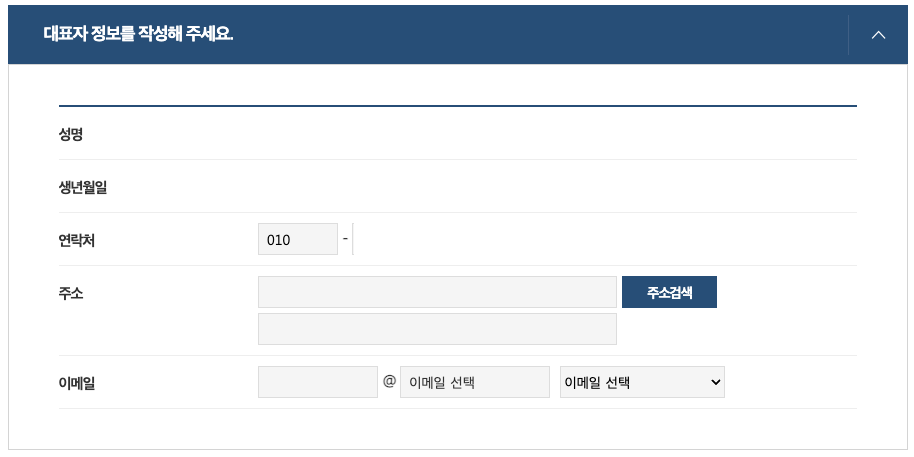 • 대표자 정보를 작성합니다. 로그인이 된 상태라면 이름, 연락처, 생년월일은 자동으로 입력되며, 나머지만 기입해 주시면 됩니다.
