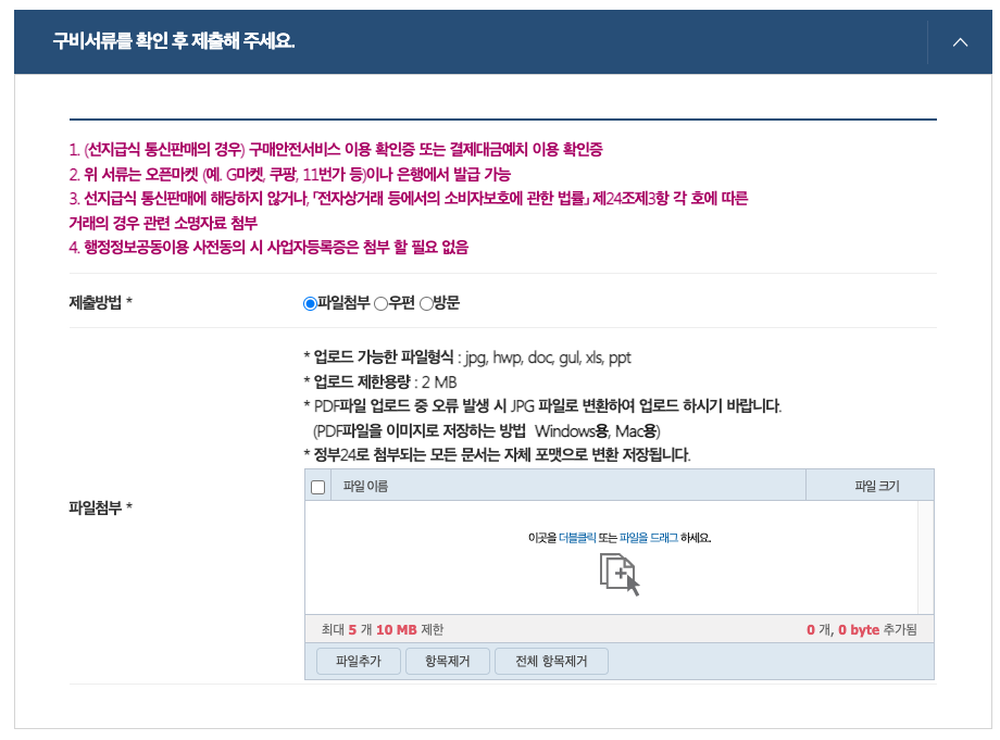 • 구비서류를 업로드합니다. (사업자등록증, 구매안전서비스이용확인증)