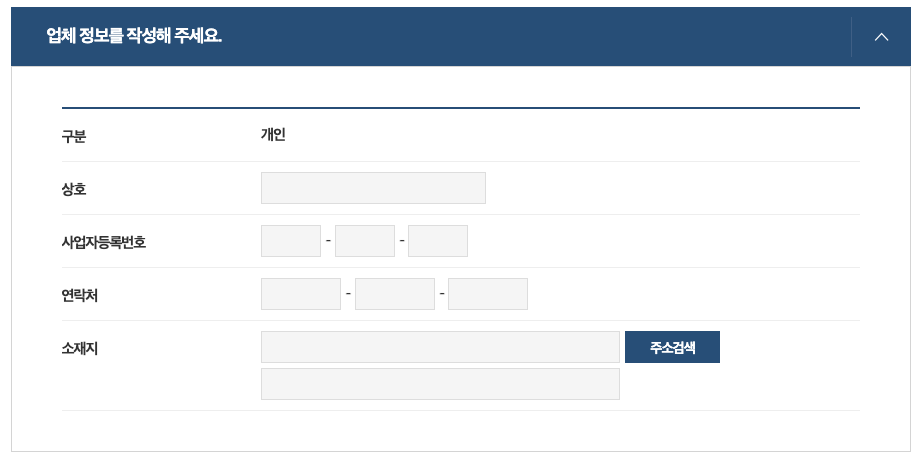 • 사업자등록증에 나온 업체정보를 작성합니다. (상호, 사업자등록번호, 소재지 등)