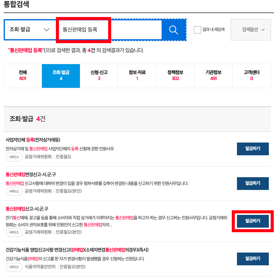 ✅  로그인 후 통합검색에 "통신판매업 등록"으로 검색하여 통신판매업 신고 발급하기 버튼을 클릭합니다.